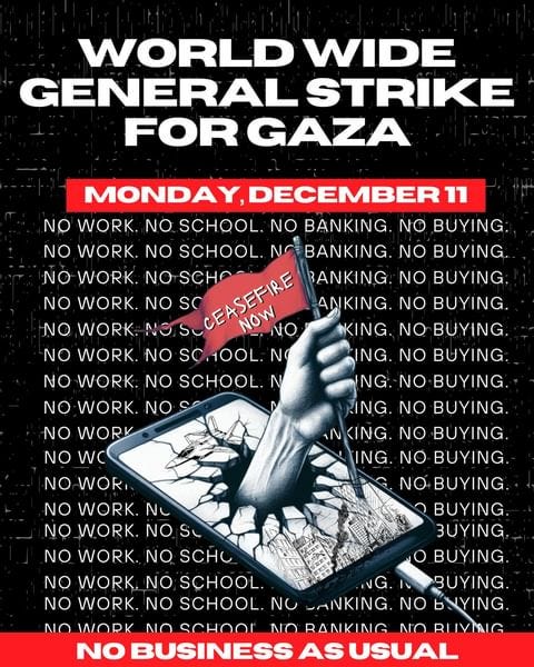 Tomorrow, December 11, Palestinian activists are calling for a global strike for Gaza. Meaning: no work, school, banking, or buying.
